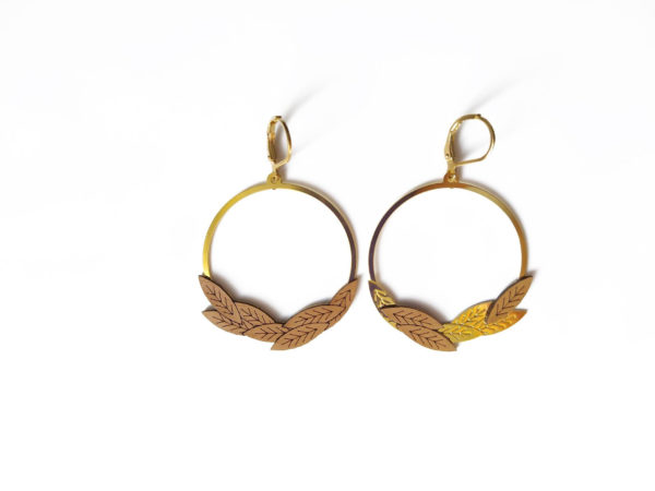 Boucles d’oreilles créoles asymétriques “Baya”, gravées en bois de prunier et laiton plaqué or.